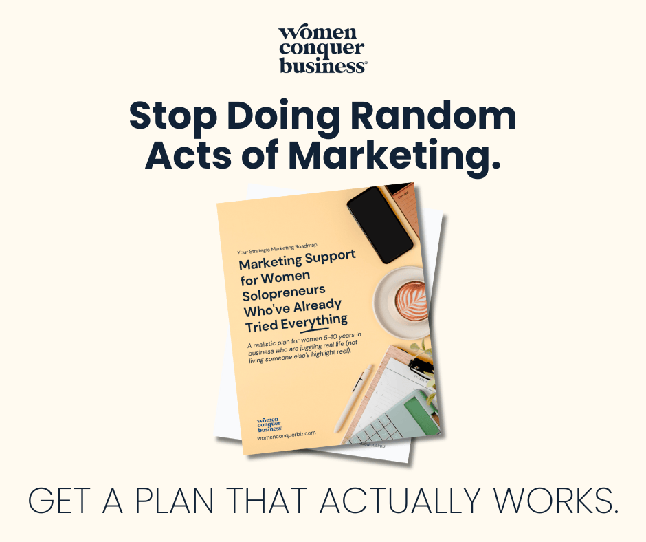 Get your free Strategic Marketing Roadmap, a realistic plan for women 5-10 years in business who are exhausted from trying everything. No more "just post consistently" advice. No more tactics built for people with teams and endless time. Just honest guidance for building a business while managing real life.